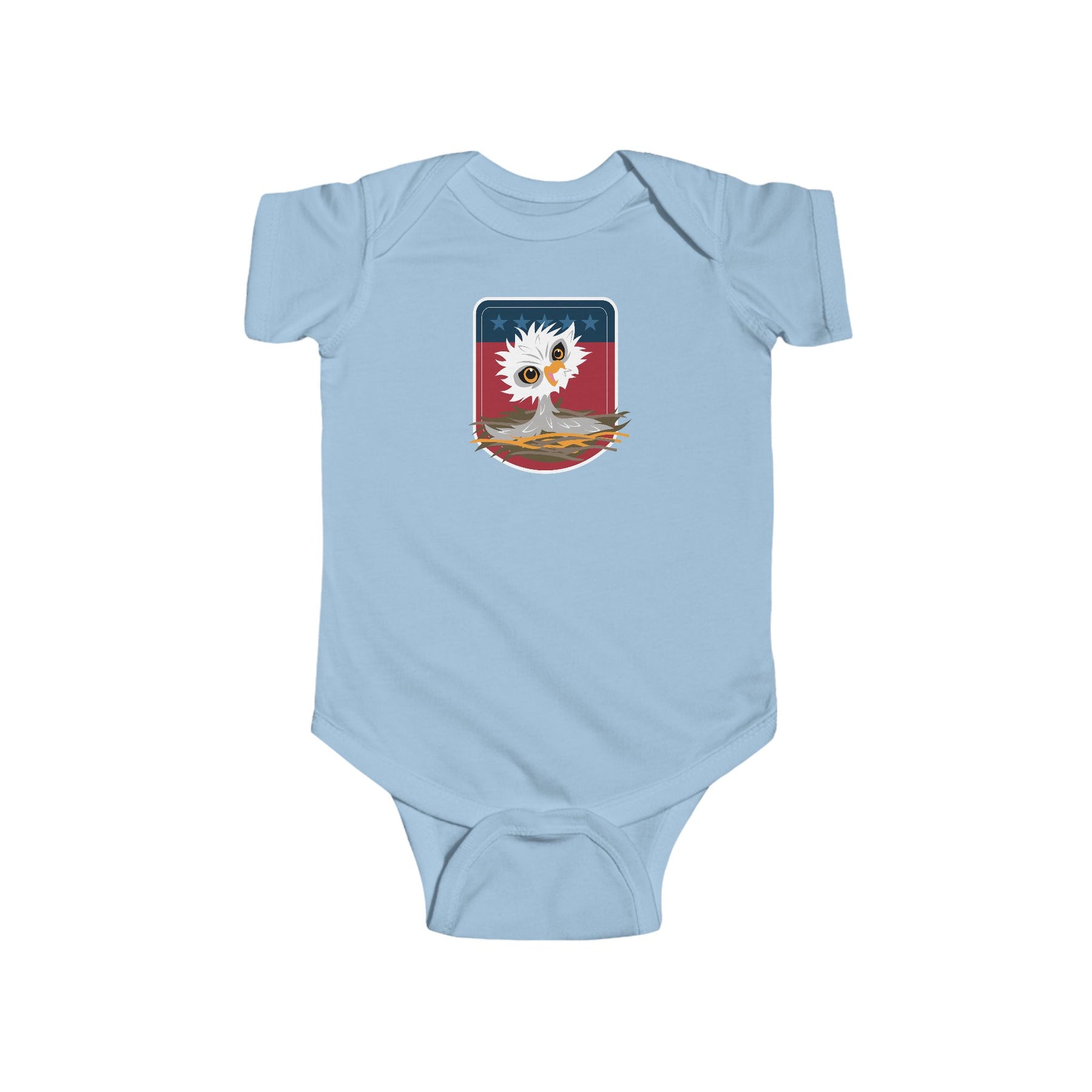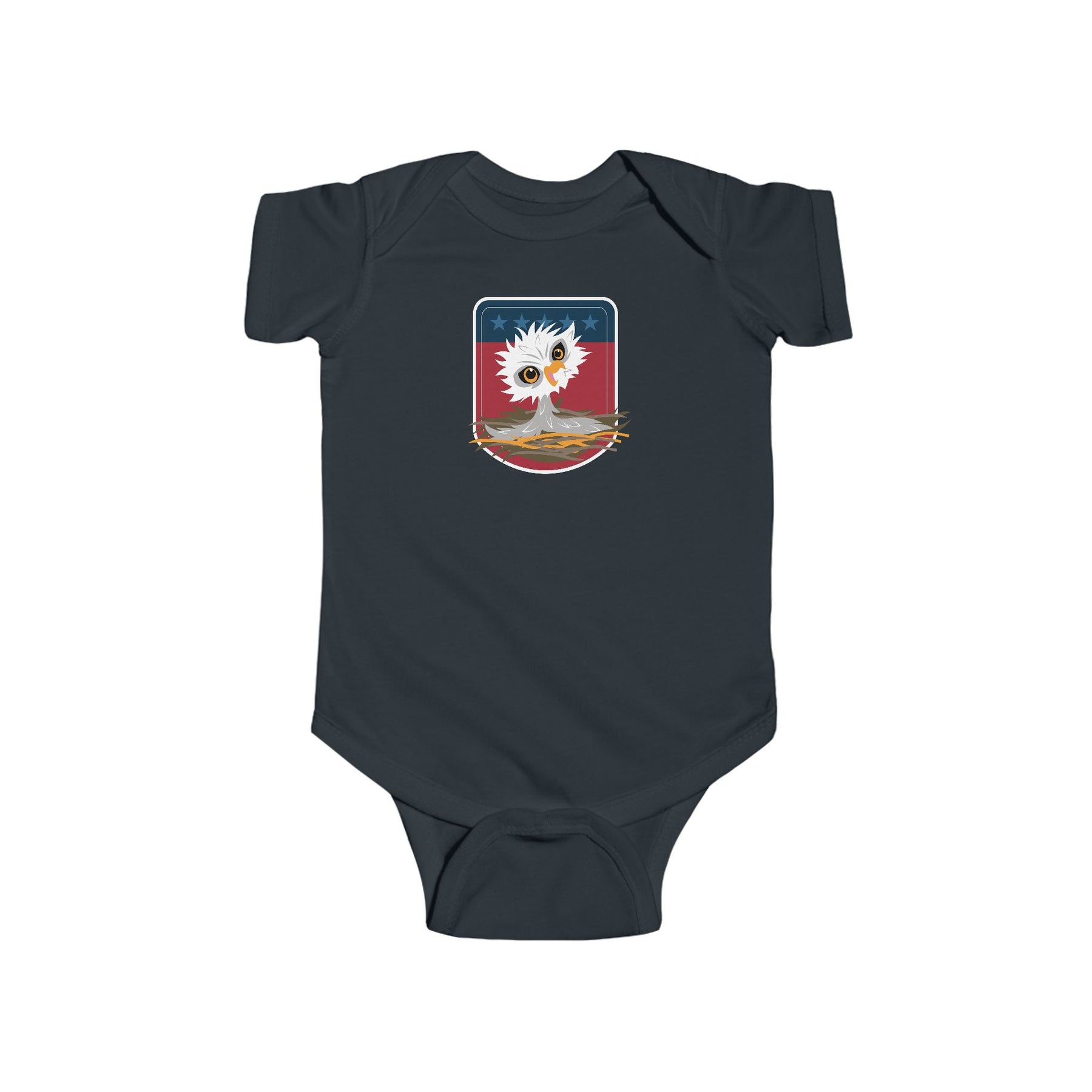 Wrap your little one in comfort and courage with the Wild America Eagle Chick Shield one-piece. Featuring a scruffy baby eagle perched in front of a patriotic shield, this ultra-soft bodysuit celebrates American spirit from day one. With a cozy fit, easy snaps, and a bold design, it’s perfect for tiny patriots ready to ruffle some feathers.